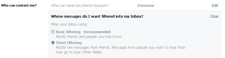 Trên hộp thoại sẽ hiện ra trường Who can contact me? (Ai có thể liên lạc với tôi?), nhấn vào nút edit (chỉnh sửa), bên phải dòng Whose messages do I want filtered into my Inbox (Tôi muốn lọc tin nhắn mà bất kỳ ai gửi đến hộp thư của tôi?), cuối cùng chọn Strict Filtering (lọc nghiêm ngặt).