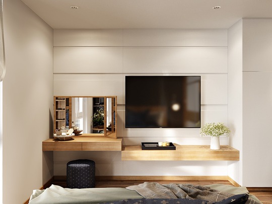 Kệ trang điểm và tivi được gắn trực tiếp lên tường để tích kiệm không gian.
