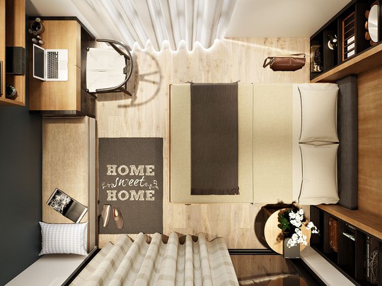 Từ trên cao nhìn xuống căn phòng khá hẹp nhưng vẫn đầy đủ tiện ích, hiện đại