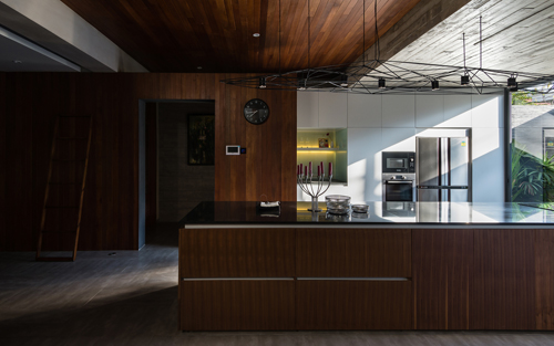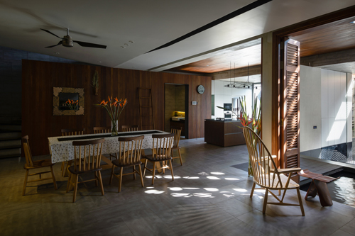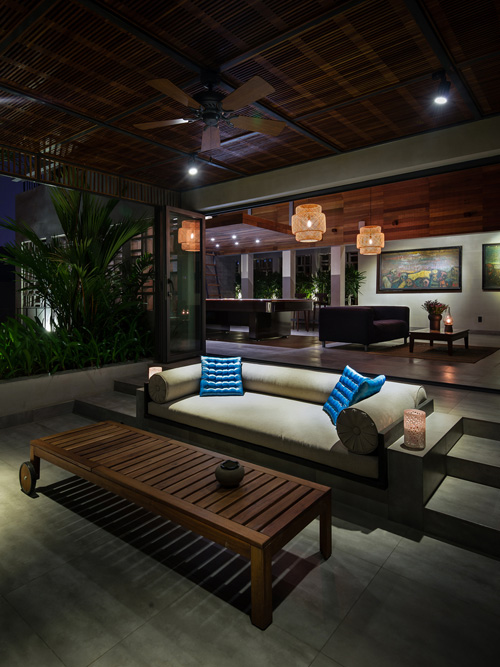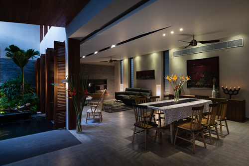 Nội thất ngôi nhà được lấy cảm hứng từ kiến trúc truyền thống Việt Nam thông qua việc sử dụng sân vườn, ao cá, hàng hiên, cửa sổ màn trập và khoảng xanh. Vật liệu tự nhiên như gỗ, đá kết hợp với bê tông tạo ra một bầu không khí nhiệt đới và thư giãn.
