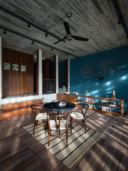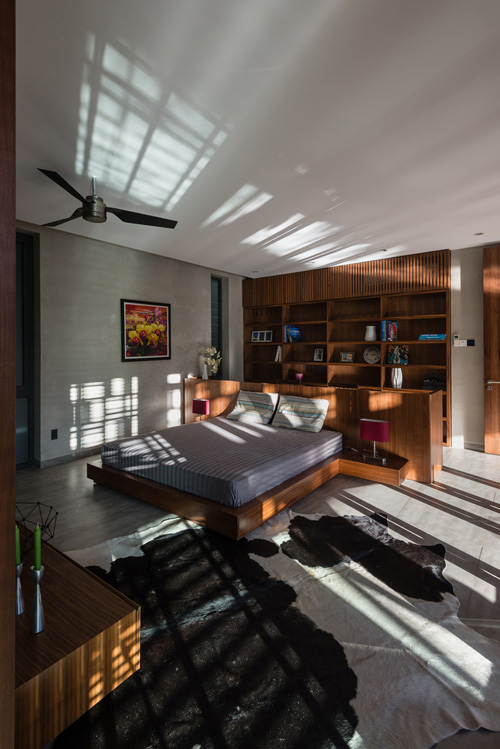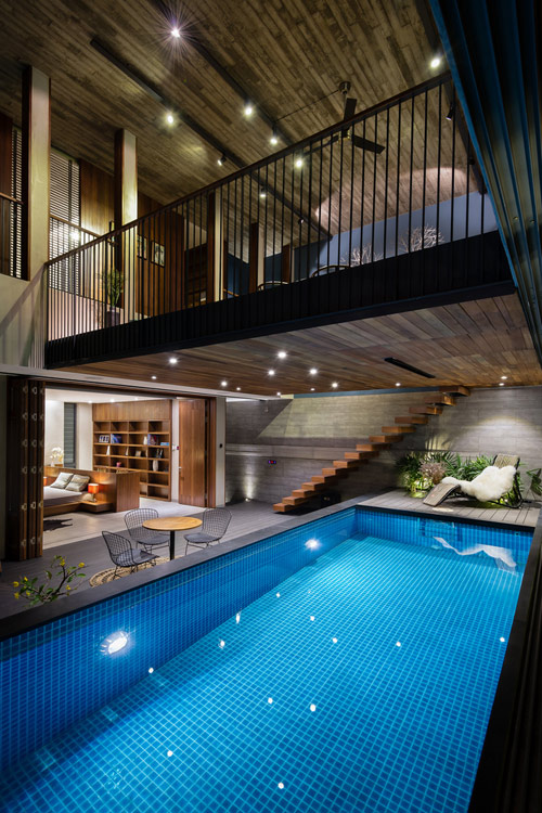 Bằng cách nâng cao hồ bơi, tầng trệt được dành cho cho các không gian chức năng khác. Hơn nữa, hồ bơi cũng giúp làm mát khoảng sân rộng phía dưới.