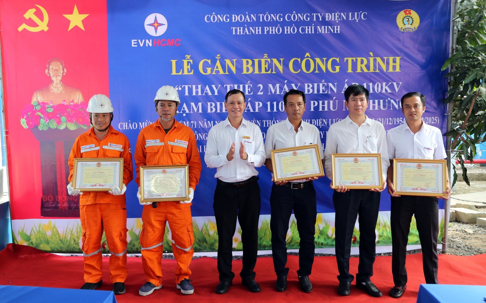 Sáng 22-12-2025, Tổng công ty Điện lực TP HCM (EVNHCMC) đã tổ chức Lễ gắn biển công trình thi đua cấp Công đoàn Tổng công ty đối với "Công trình thay MBT T1, MBT T2 40MVA ABB bằng MBT 40MVA EEMC thay cáp lực 22kV từ MBT T1 đến MC 431 và cáp lực 22kV từ MBT T2 đến MC 432 tại trạm 110/22kV Phú Mỹ Hưng". Tham dự buổi lễ có ông Phạm Văn Thảo, Phó chủ tịch Công đoàn Tổng công ty cùng ban lãnh đạo và CB-CNV Công ty lưới điện Cao thế TP HCM, cùng đại diện các đối tác, nhà thầu của công trình.