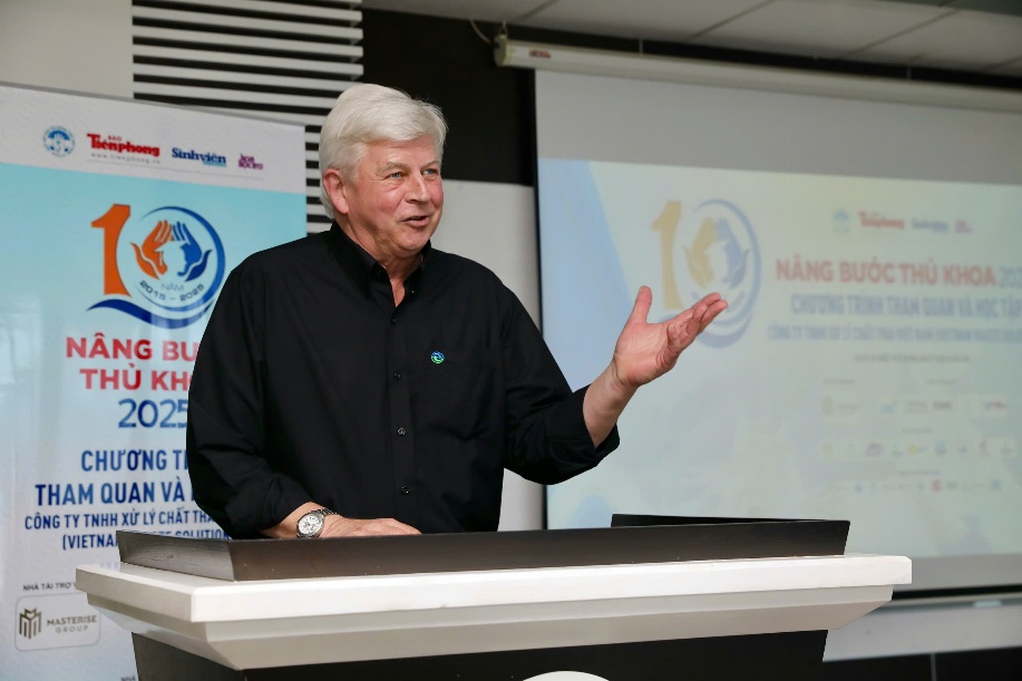 Với vai trò là nhà tài trợ đồng hành hằng năm, VWS gửi lời chúc mừng đến gần 100 tân thủ khoa suất sắc được xét nhận học bổng chương trình Nâng bước thủ khoa 2025, ông Kevin Moore, Giám đốc điều hành VWS đã chia sẻ nhiều thông tin bổ ích liên quan đến khu xử lý rác của VWS. Theo đó, bãi rác Đa Phước hiện đang vận hành một trong những hệ thống xử lý rác hiện đại nhất cả nước, áp dụng công nghệ chôn lấp hợp vệ sinh của Mỹ. Hiện mỗi ngày, Khu Liên hợp Đa Phước đang tiếp nhận và xử lý trung bình 4.000 - 4.500 tấn rác thải sinh hoạt cho thành phố, với công suất tiếp nhận tối đa đạt 10.000 tấn rác/ngày.