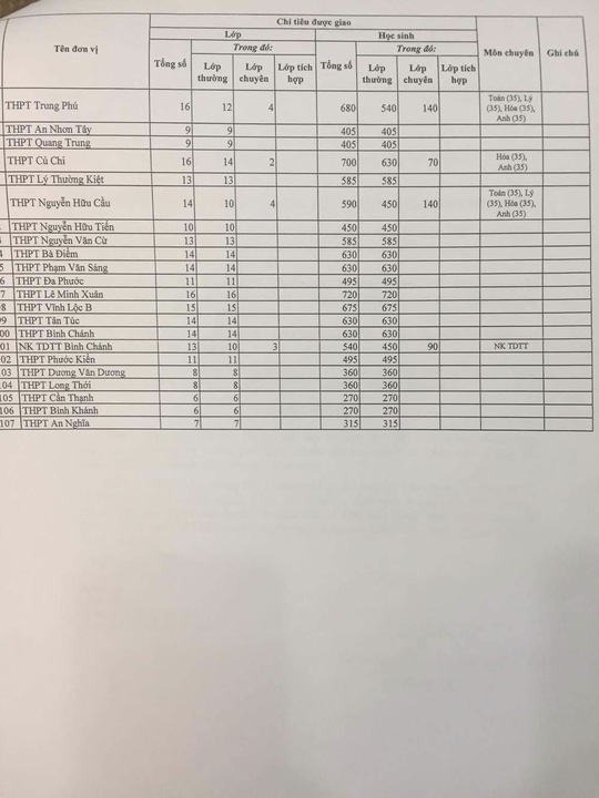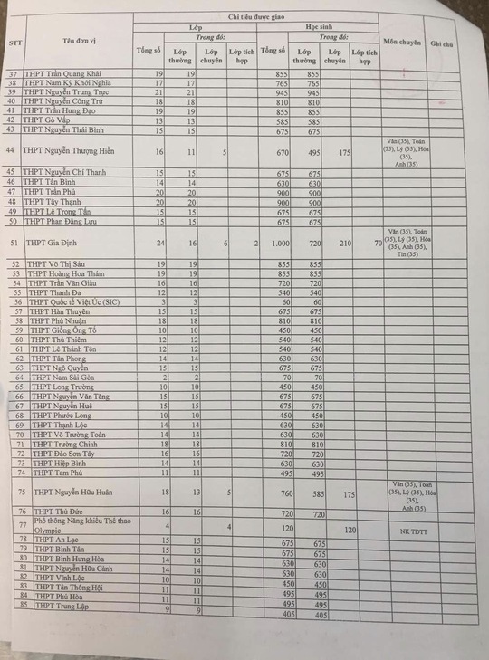 So với năm ngoái, tổng chỉ tiêu vào lớp 10 năm nay tăng hơn 1.000. Theo thống kê của sở, trường có chỉ tiêu tuyển sinh cao nhất là THPT Hùng Vương với 1.125 chỉ tiêu, kế đến là THPT Mạc Đĩnh Chi với 1.020 em và THPT Gia Định tuyển 1.000 chỉ tiêu. Những trường có chỉ tiêu hơn 900 thí sinhnhư Marie Curie, Nguyễn Trung Trực, Trần Phú, Tây Thạnh...
