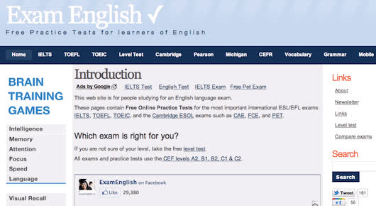 Exam English - bao gồm bài kiểm tra tiếng Anh như TOEFL, CPE, KET,…Hầu như tất cả các bài thi dành cho người học tiếng Anh đều có trên trang web. Không những thế, bạn còn có thể tự kiểm tra trình độ của mình ở từng kĩ năng cụ thể như đọc hiểu, nghe, ngữ pháp, vốn từ vựng, viết luận,…