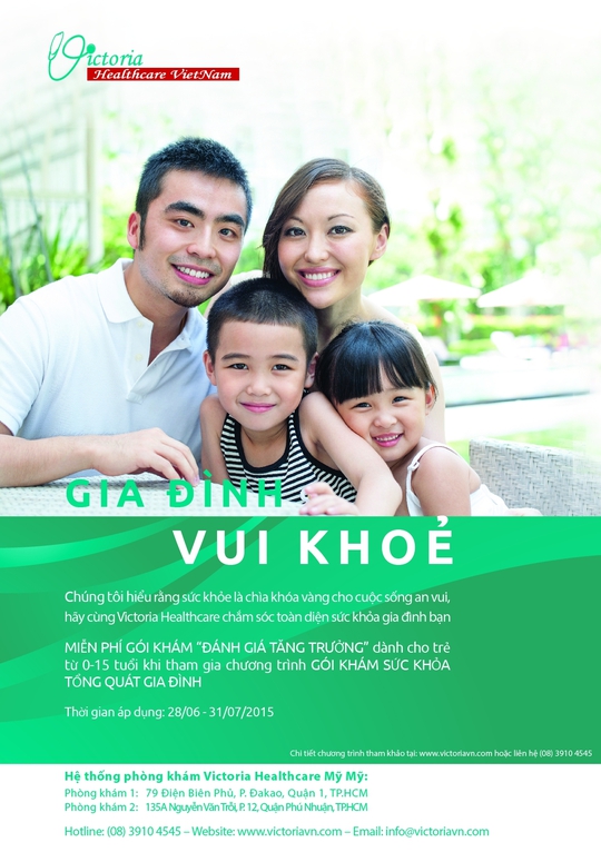 Hiểu rõ được nhu cầu này, phòng khám Victoria Healthcare giới thiệu chương trình ưu đãi: “Gia đình vui khỏe”. Chương trình bắt đầu từ ngày 28/06 đến 31/07/2015, được áp dụng đối với mỗi nhóm (2-3) khách hàng sử dụng các gói khám sức khỏe tổng quát bất kỳ, sẽ được tặng 02 “Gói khám kiểm tra tăng trưởng” miễn phí dành cho trẻ từ 0-15 tuổi.