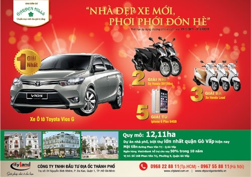 Theo đó, kể từ nay đến ngày 31-5, khi mua sản phẩm nhà ở tại các dự án đang mở bán của Cityland, khách hàng có cơ hội rút thăm trúng thưởng chương trình “Nhà đẹp xe mới, phơi phới đón hè” với tổng giải thưởng lên đến hơn 1 tỉ đồng (ảnh).