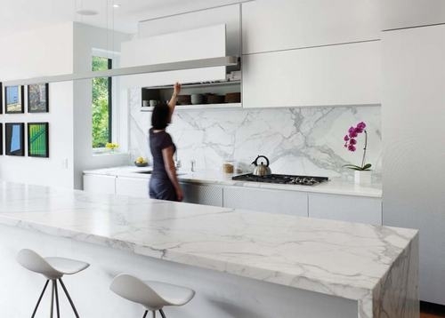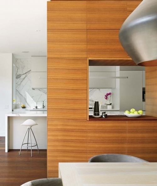 Các phòng ăn và phòng bếp được ngăn cách bởi một sàn gỗ với hệ thống tường điêu khắc, giúp tăng gấp đôi không gian lưu trữ.