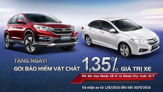 Theo đó, khách hàng ký hợp đồng đặt mua xe Honda CR-V hoặc Honda City trong khoảng thời gian trên, sau đó thanh toán và nhận xe trong khoảng thời gian từ ngày 1-8 đến hết 30-9 sẽ được tặng 1 gói bảo hiểm vật chất dành cho ô tô.