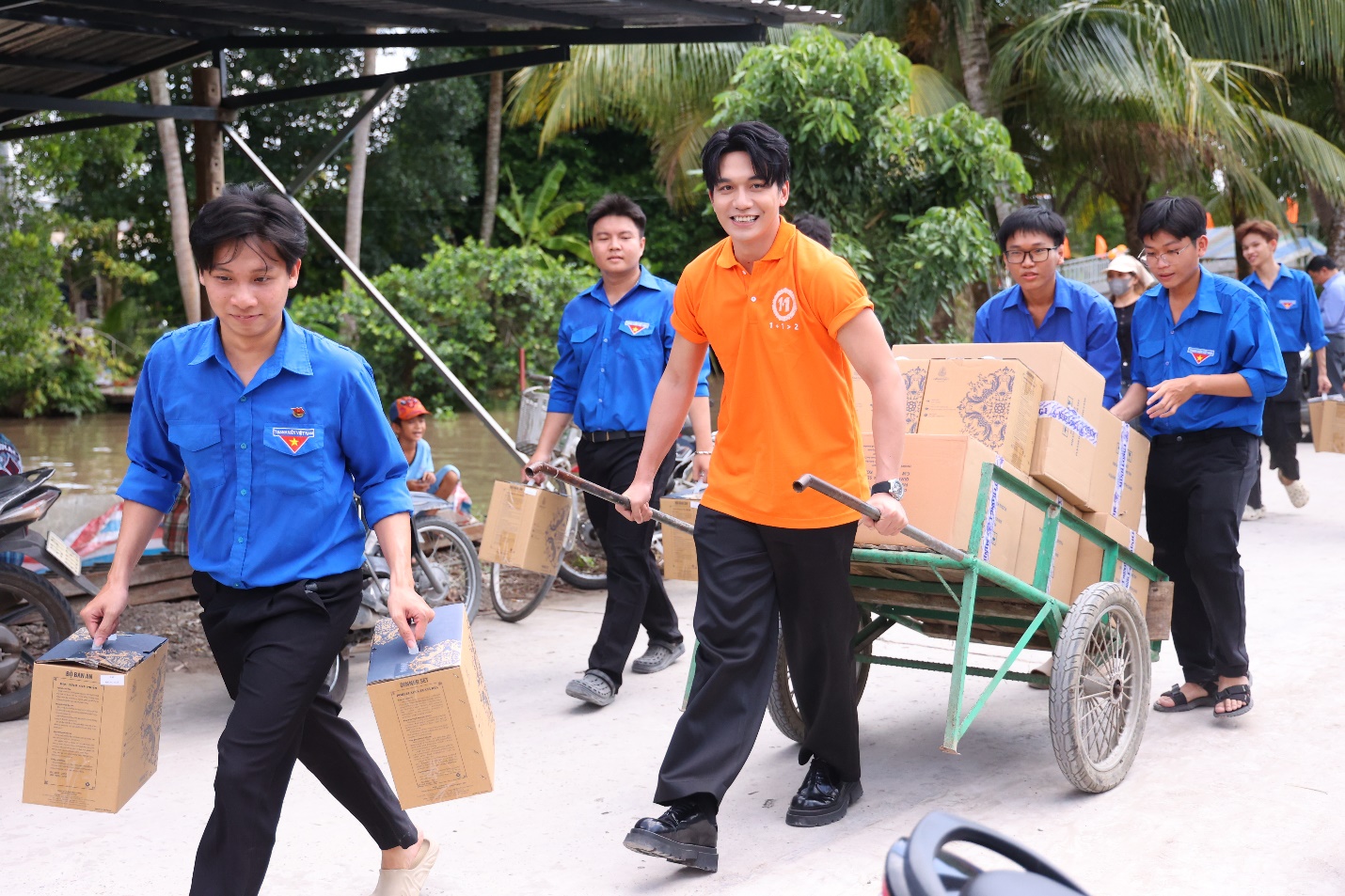 Diễn viên Đỗ Nhật Hoàng chung sức cùng các tình nguyện viên mang các phần quà ý nghĩa đến người dân xã Hỏa Lựu