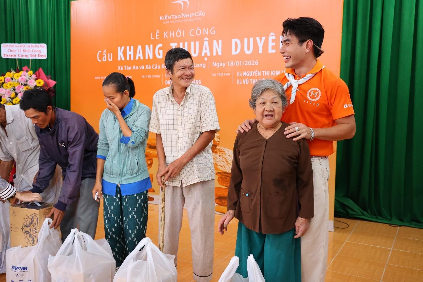 Gắn bó với Quỹ Nam Phương trong vai trò Đại sứ suốt nhiều năm qua, diễn viên Lê Dương Bảo Lâm đã trở thành gương mặt thân quen trong nhiều hành trình thiện nguyện của Quỹ. Trực tiếp tham gia nghi thức xúc cát khởi công cầu Khang Thuận Duyên, nam nghệ sĩ chia sẻ: "Rất hay về miền Tây làm chương trình nên Lâm hiểu nỗi vất vả của bà con khi đi qua những cây cầu sập xệ, lắt léo, và đôi khi là những tai nạn đáng tiếc xảy ra. Nên khi có thời gian thì Lâm sẽ đồng hành cùng Quỹ Nam Phương để được thấy nụ cười của bà con và nhìn những cây cầu sắp được hoàn thành. Qua đó, Lâm cảm thấy rất vui và hạnh phúc, đồng thời Lâm hay nói vui là "được tích phước" cho bản thân và gia đình. "Một cây làm chẳng nên non", Lâm hy vọng có thể góp sức cùng Quỹ và các nhà hảo tâm để có thêm nhiều những cây cầu khang trang nữa cho bà con miền Tây và toàn thể đất nước Việt Nam của chúng ta".