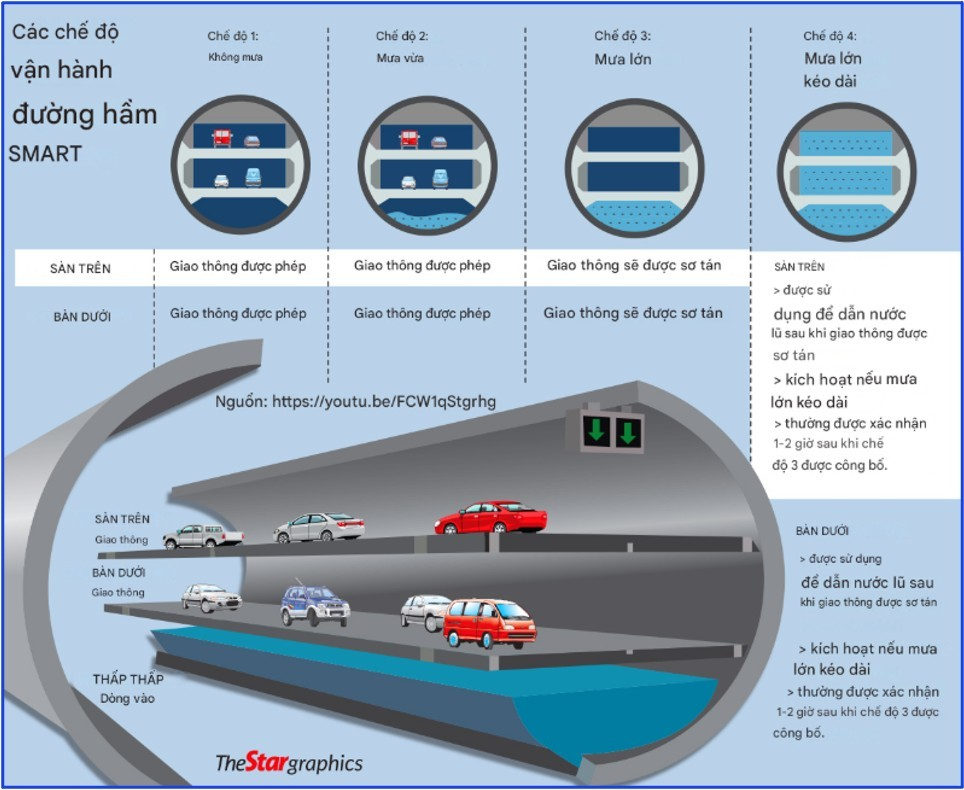 Mô hình này được thiết kế với đường kính hầm khoảng 13m, bên trong có hai tầng, mỗi tầng gồm hai làn xe ô tô. Trong điều kiện bình thường, hầm hoạt động như tuyến giao thông ngầm, góp phần giảm áp lực cho mặt đất. Khi mưa lớn, hầm được chuyển đổi chức năng, trở thành khoang chứa và thoát nước khẩn cấp. Trung bình, mỗi km hầm TBM có thể chứa khoảng 130.000 m³ nước, tương đương khả năng xử lý ngập cho khoảng ba km đường phố có mặt cắt ngang 50m. Cơ chế vận hành của mô hình này tương tự như hầm SMART Tunnel tại Kuala Lumpur, công trình đã chứng minh hiệu quả trong việc kết hợp giảm ùn tắc giao thông và chống ngập đô thị.