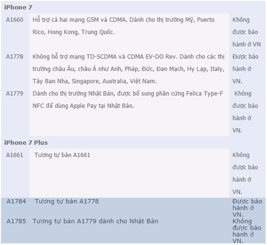 Những máy chính hãng bán ra bởi Thế Giới Di Động, FPT Shop, Viễn Thông A... đều có mã VN/A. iPhone 7 chính hãng là model A1778 và iPhone 7 Plus là A1784. Đây đều là những model dùng chip mạng Intel và chỉ hỗ trợ băng tần GSM. Mã hiệu này được khắc ngay sau lưng máy. Người dùng có thể kiểm tra ngay khi chọn mua iPhone.