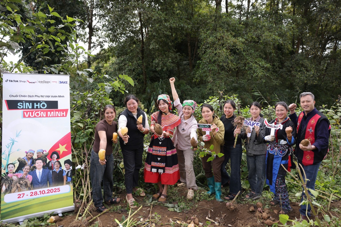 Cô Ba Tây Bắc (áo trắng), người đã dẫn dắt nhiều chị em vùng cao Sìn Hồ đưa khoai sâm đất lên TikTok Shop