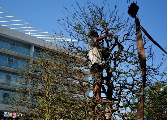 Trong chiều 31/1, anh Trương Thanh Viễn (huyện Củ Chi, TP HCM) chuyển tới hội hoa xuân Phú Mỹ Hưng cặp mai vàng cao khoảng hơn 3 m, với rất nhiều cành và nụ hoa.