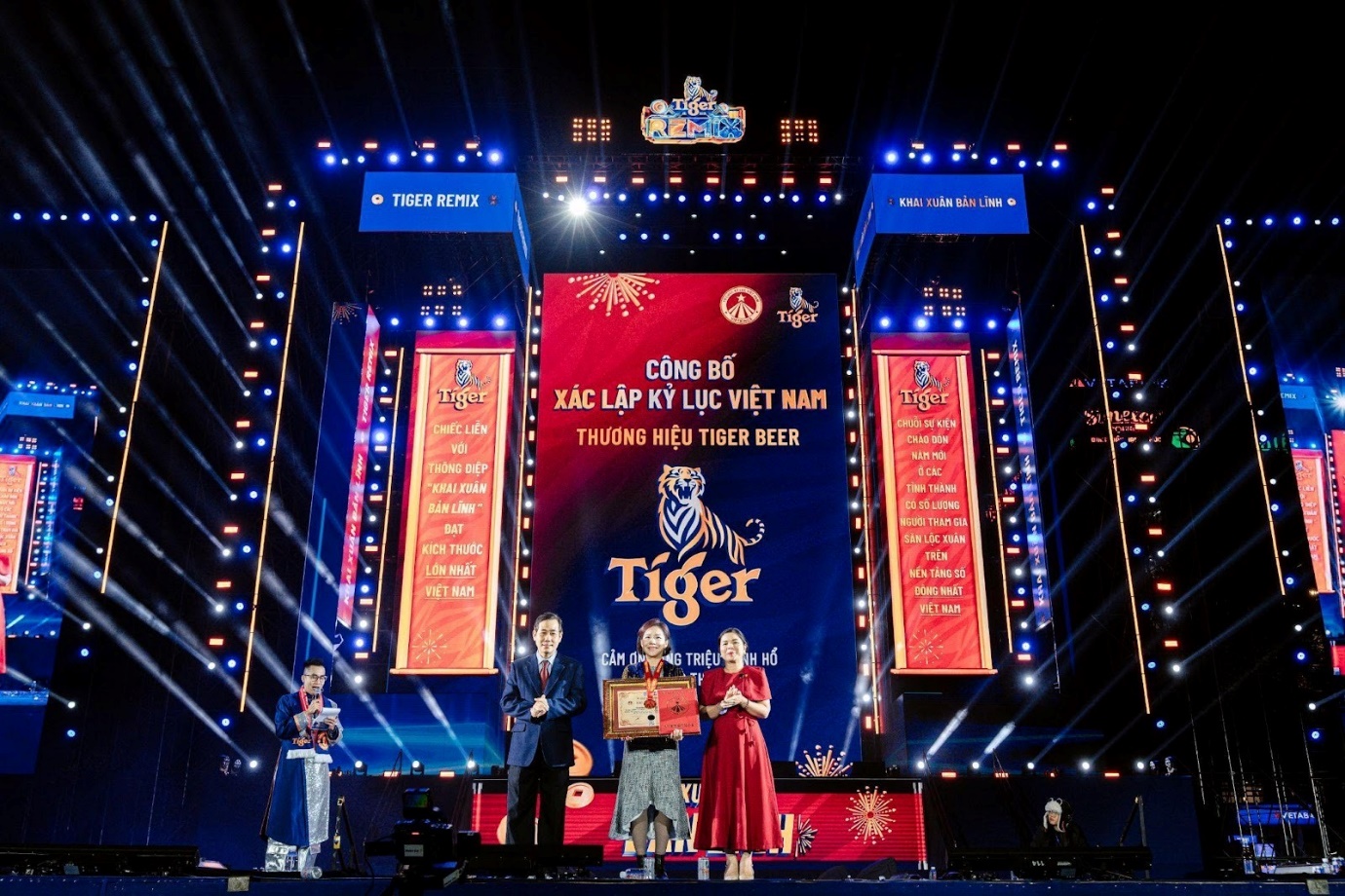 Trên tinh thần kết nối văn hóa Việt, Tiger Remix 2026 còn ghi dấu ấn với cột mốc xác lập kỷ lục cho "Chiếc liễn mang thông điệp Khai Xuân Bản Lĩnh có kích thước lớn nhất Việt Nam". Chiếc liễn chúc Tết khổng lồ xuất hiện tại sự kiện như một biểu tượng tinh thần, kết nối những giá trị văn hóa truyền thống với nhịp sống hiện đại, gửi gắm lời chúc về một khởi đầu thuận lợi và mở ra năm mới tràn đầy khí thế.