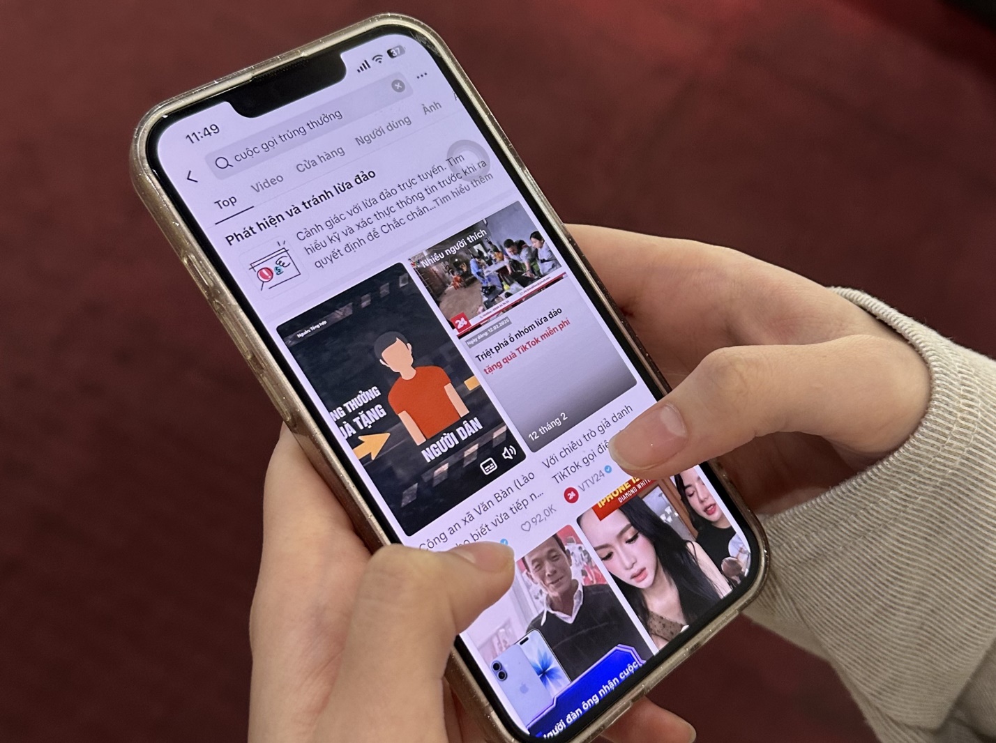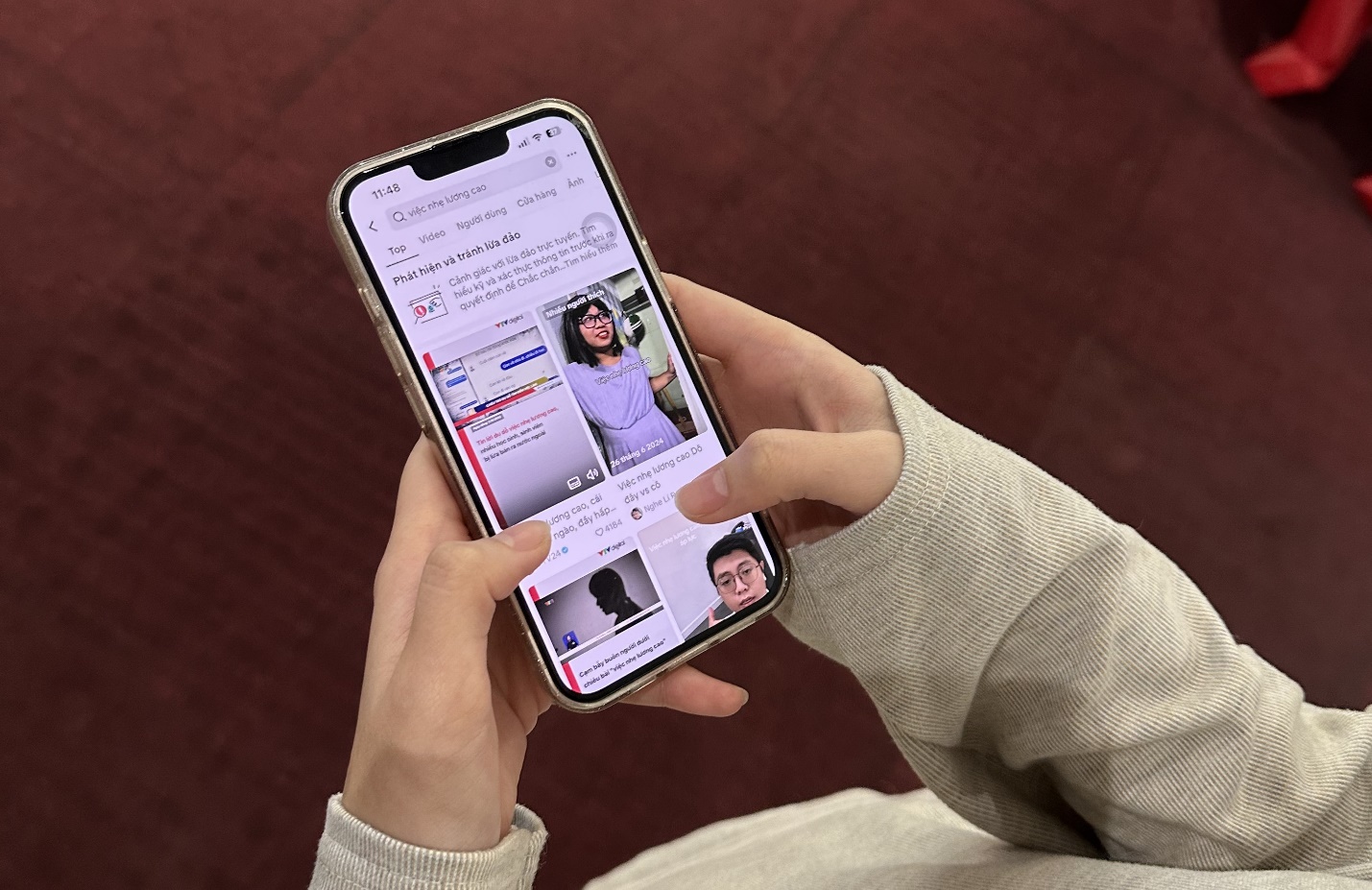 Thứ hai, cảnh báo trên thanh tìm kiếm: Khi người dùng chủ động nhập các từ khoá có liên quan vào thanh tìm kiếm trên nền tảng, chẳng hạn như: việc nhẹ lương cao, nhận quà 0 đồng, link nhận thưởng, tuyển dụng gấp, người yêu online... TikTok sẽ hiển thị thông báo cảnh báo cùng đường dẫn đến trang tổng hợp các thông tin và hướng dẫn cách phòng chống lừa đảo trực tuyến từ các chuyên gia và các nhà sáng tạo nội dung trên TikTok.
