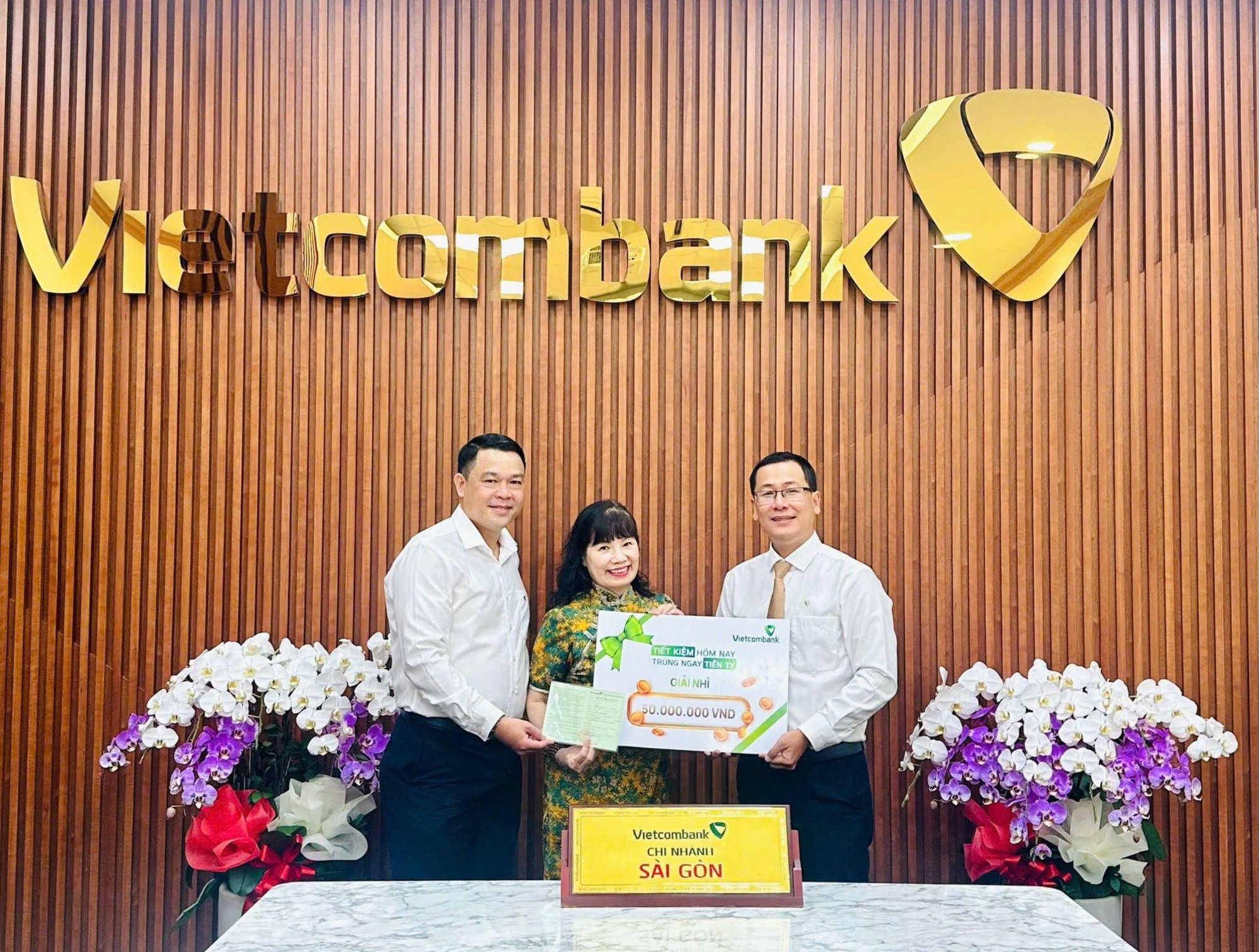 Chị V.T.M. Hương được trao Giải Nhì trị giá 50 triệu đồng trong chương trình "Tiết kiệm hôm nay - Trúng ngay tiền tỷ" tại Vietcombank Chi nhánh Sài Gòn.