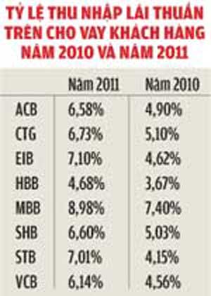 Trong tình hình cả nền kinh tế tăng trưởng bị chậm lại, rủi ro cho vay tăng và đặc biệt là bị giới hạn về tăng trưởng tín dụng thì các NHTM đã có xu hướng gia tăng mức lãi suất cho vay đối với khách hàng để bù đắp các rủi ro. Điều này khiến cho lợi nhuận biên từ hoạt động tín dụng khi cho vay đối với khách hàng có xu hướng tăng cao. Có thể nhận thấy rằng, “tỉ lệ thu nhập lãi thuần trên giá trị cho vay khách hàng” của năm 2011 đều cao hơn nhiều so với năm 2010. Đây cũng có thể là một trong những nguyên nhân lý giải cho việc lợi nhuận của hệ thống ngân hàng trong năm 2011 vẫn tiếp tục duy trì được đà tăng trưởng.