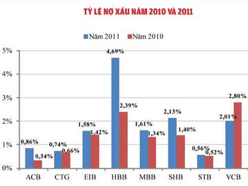 Không chỉ có vậy, tỉ lệ nợ xấu cũng như nợ nhóm 2 của các NHTM đã tăng mạnh so với cùng kỳ năm trước. Nợ xấu chung của hệ thống ngân hàng ở mức 3,3% tổng dư nợ, cao hơn so với mức 2,14% vào cuối năm 2010. Còn theo số liệu của tám NHTM đã công bố báo cáo tài chính riêng lẻ quý 4/2011 thì chỉ có VCB có tỉ lệ nợ xấu giảm nhẹ, còn lại các NHTM khác đều có tỉ lệ nợ xấu tăng cao. Riêng Habubank, tỉ lệ nợ xấu tăng mạnh từ 2,39% năm 2010 lên 4,69% năm 2011. Nợ nhóm 2 của các ngân hàng đều có sự tăng nhanh cả về giá trị tuyệt đối và tỉ lệ tương đối. Các NHTM có tỉ lệ này tăng nhanh nhất là HBB từ 9,86% năm 2010 lên 13,34%, VCB tăng từ 5,27 lên 8%, MBB tăng từ 0,6 lên 1,76%...