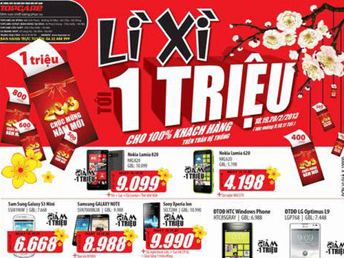 Tiếp tục thể hiện sự mạnh tay khuyến mại của doanh nghiệp điện máy hàng đầu miền Bắc, hệ thống siêu thị điện máy Topcare quyết định dành tặng 100% khách hàng những phong bao “lì xì” đầu năm mới giá trị lên đến 1 triệu đồng.
